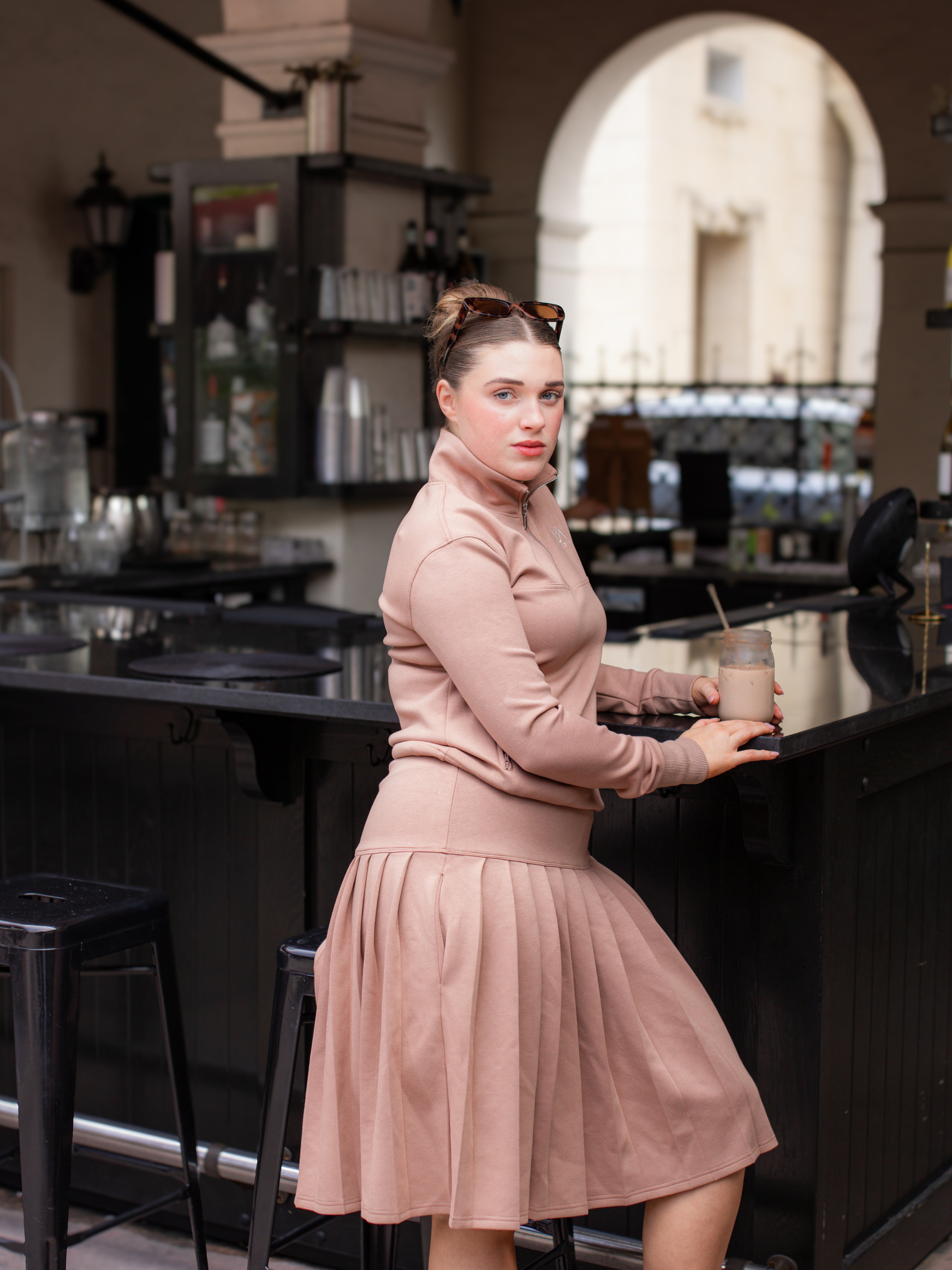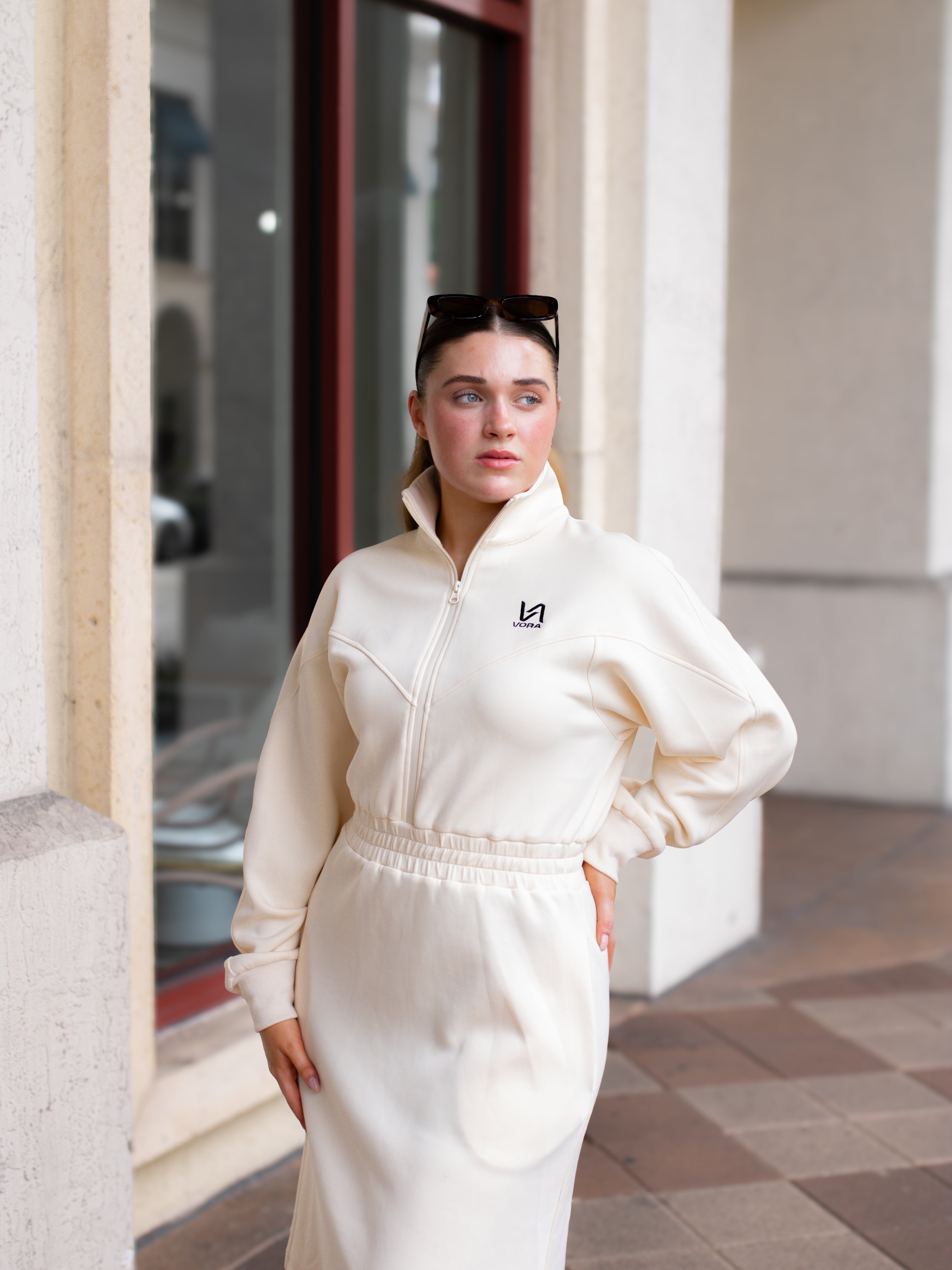 The Vora Dress merges refined design with effortless performance. Crafted from soft, flexible fabric, its long-sleeve silhouette moves fluidly while maintaining a sculpted, feminine form. Functional pockets add subtle practicality — a harmony of comfort and quiet luxury.